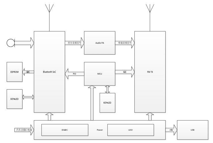 (1)供电部分:将汽车点烟口的12VDC或者24VDC转换为5VDC供其他部分电路使用。(2)USB部分:将5VDC输出到USB端口,并且根据D+和D-信号线的电平控制充电电流。(3)蓝牙部分:负责接受用户的手机或者平板的蓝牙信号再转换为差分音频信号,输出给音频PA。(4)音频PA部分:负责将蓝牙芯片输出的差分音频信号转换为单端音频信号,再输出给FM芯片(4)FM部分:负责将输入的单端音频信号转换为FM射频信号,再发射给汽车的FM收音机。